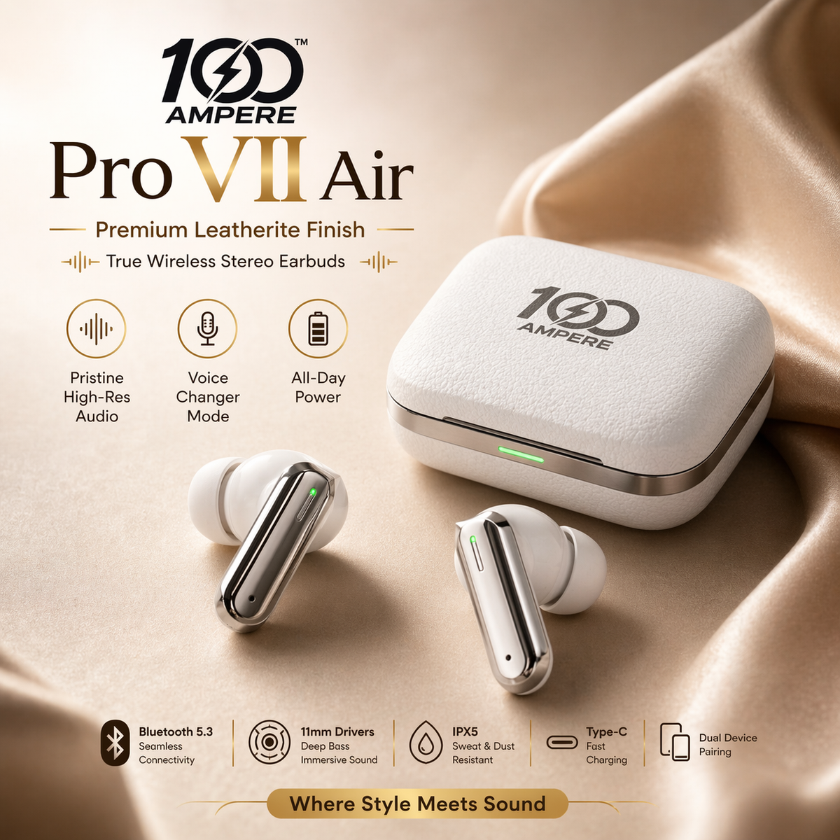Upgrade your listening experience with the 100Ampere Pro VII Air True Wireless Earbuds - where luxury design meets powerful performance.